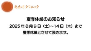 2025年12月29日(月)午後より2026年1月4日(日)まで休診いたします。休診期間中はご不便をおかけいたしますが、ご了承くださいますようお願い申し上げます。