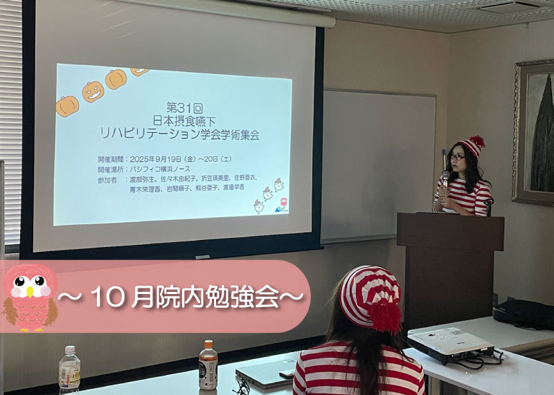 10月の院内勉強会を実施しました。 (午後に法人内のハロウィンイベントがあり、皆ウォーリーの仮装で参加しました) 勉強会① ・第12回日本在宅栄養管理学会学術集会 ・第31回日本摂食嚥下リハビリテーション学会学術集会 上 […]