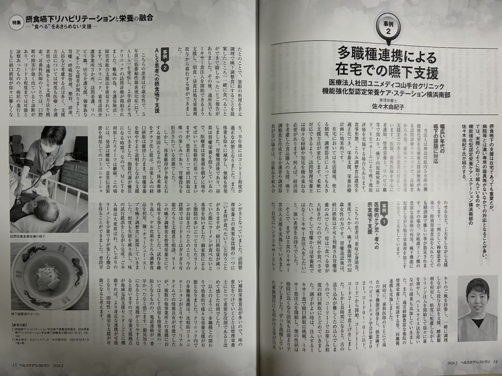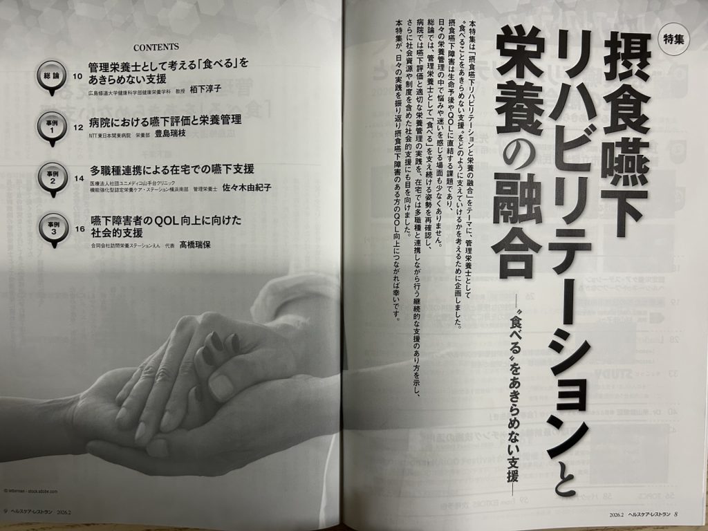 日本医療企画が発行する「ヘルスケア・レストラン」誌 2026年2月号での「摂食嚥下リハビリテーションと栄養の融合〜“食べる”をあきらめない支援〜」の特集にユニメディコの管理栄養士が執筆させていただきました。